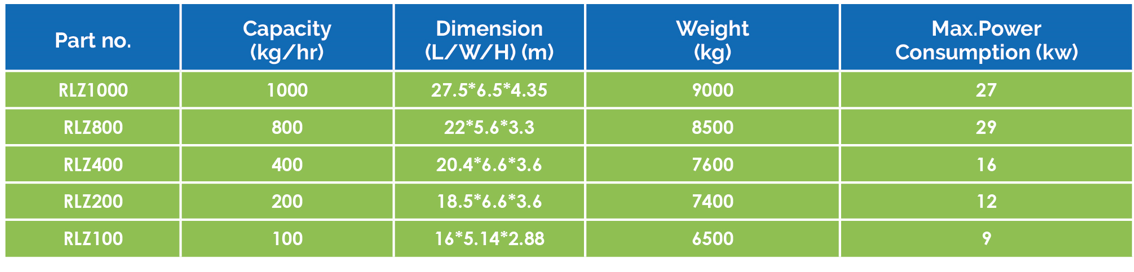 In different models according to the desired capacities 70kg/h to 800kg/h.